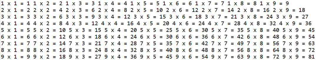 System.out.print(i + " x " + j + " = " + (i * j) + " ");