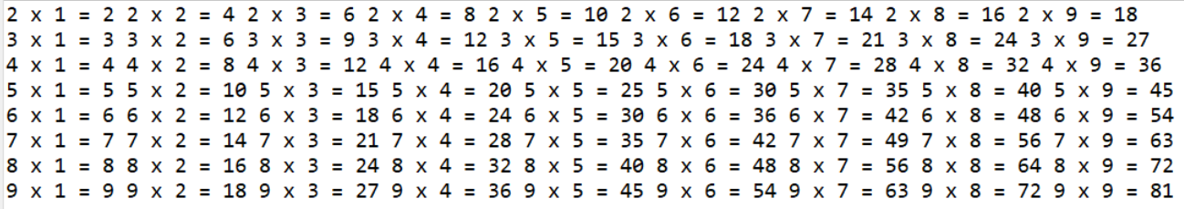 System.out.print(n + " x " + m + " = " + (n * m) + " ");