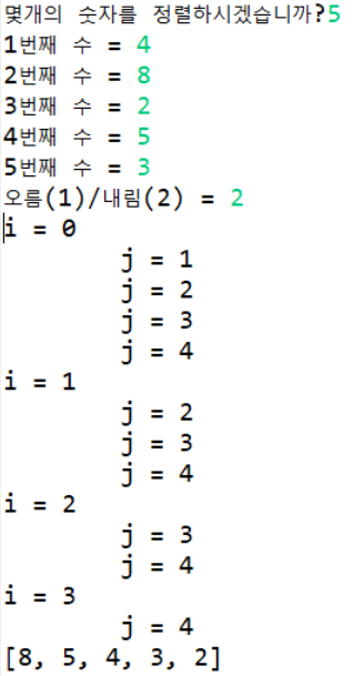 - 맨 앞 숫자를 그 다음 숫자부터 끝까지 비교하면서 자리를 옮겨줌