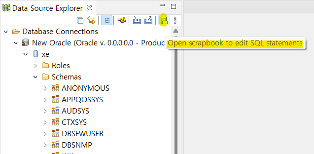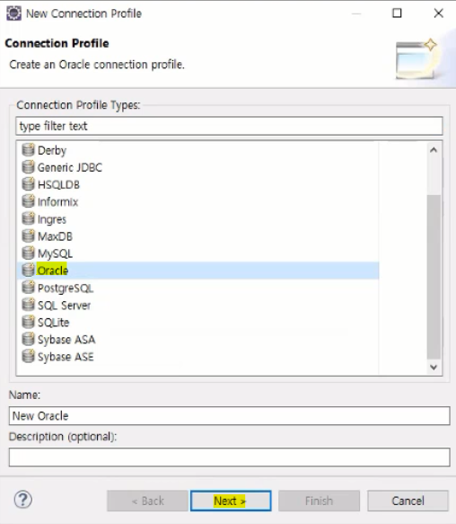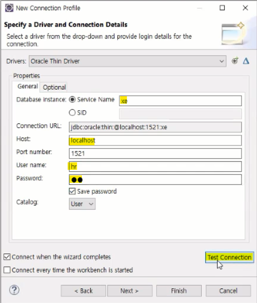 아까 연결한 대로 Type : Oracle_11 / Name : New Oracle / Database : xe로 설정