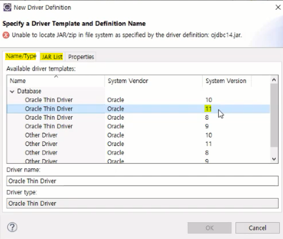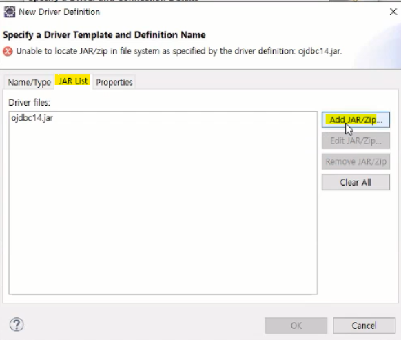 기존에 있던 ojdbc14.jar는 Remove JAR/Zip으로 삭제 후 OK