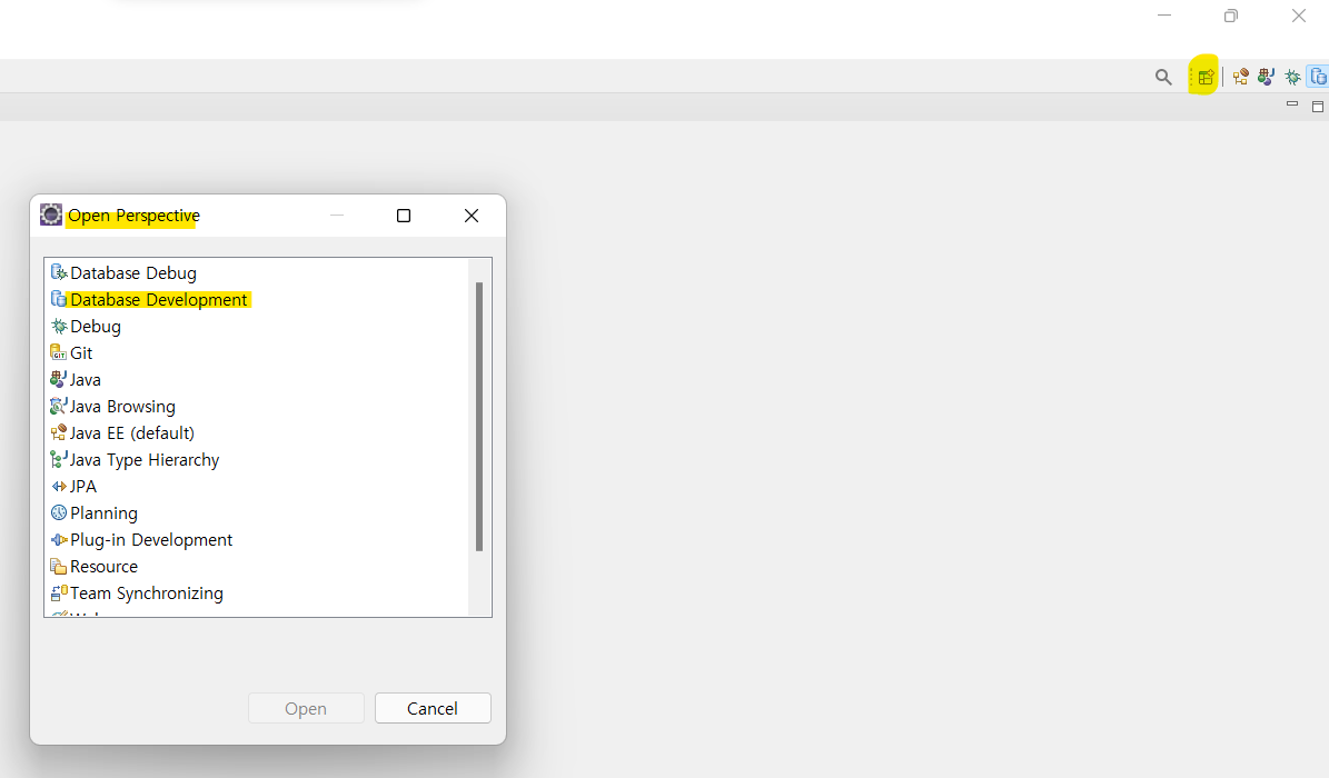화면 우측 위에 Open Perspective 버튼 클릭 - Database Development 클릭 후 Open
