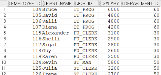WHERE (job_id, salary) IN (SELECT job_id, MIN(salary) -- 넘어오는 값 같이 비교
