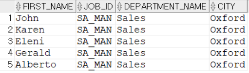 WHERE job_id = 'SA_MAN') e, departments d, locations l