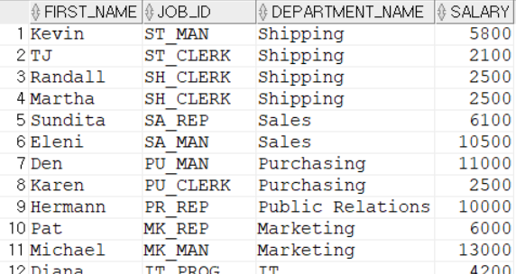 SELECT e.first_name, e.job_id, d.department_name, salary