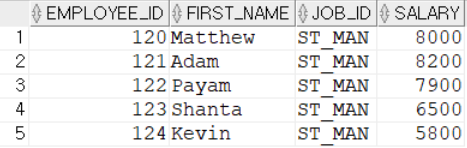문제8) EMPLOYEES 테이블에서 (사원번호가 123인 사원의 직업)과 같고 (사원번호가 192인 사원의 급여(SAL))보다 많은 사원의 사원번호,이름,직업,급여를 출력하라.