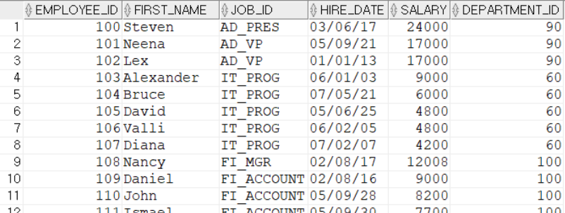 SELECT employee_id, first_name, job_id, hire_date, salary, department_id