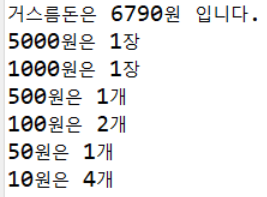 System.out.println("거스름돈은 " + changeMoney + "원 입니다.");